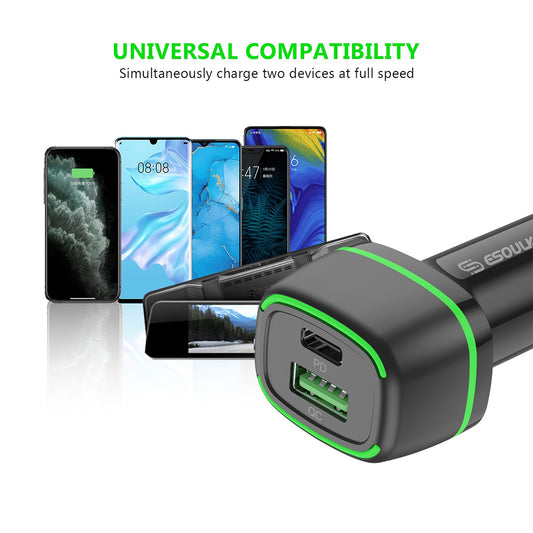 EA15-BK 36W FAST CAR CHARGER 18W PD+18W QC -ESoulk Cargador de Coche Rápido 36W - PD 18W y QC 18W - Doble USB - Protecciones Integradas