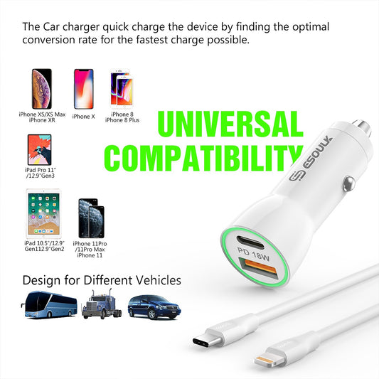 EC09P-CL-WH 18W Car Charger PD&2.4A USB with 3ft C to 8Pin cable - ESoulk PD USB-A 18W Cargador de Coche con Cable C a iPhone (3 pies) - MFi