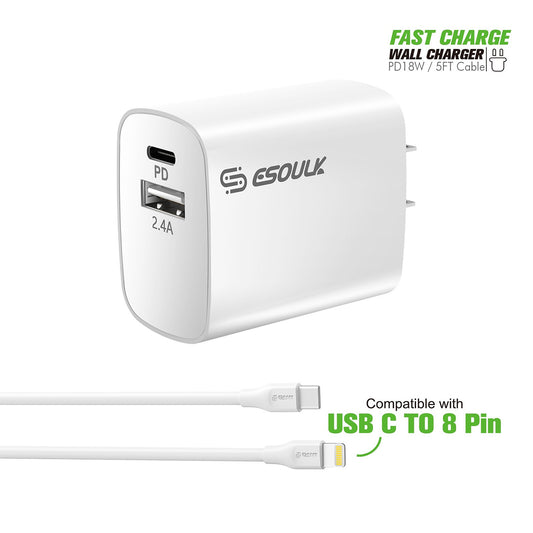EC10P-CL-WH 18W Wall Charger PD&2.4A USB with 5ft C to 8Pin cable - ESoulk PD USB-A 18W Cargador de Pared con Cable USB-C a Lightning (5 pies)