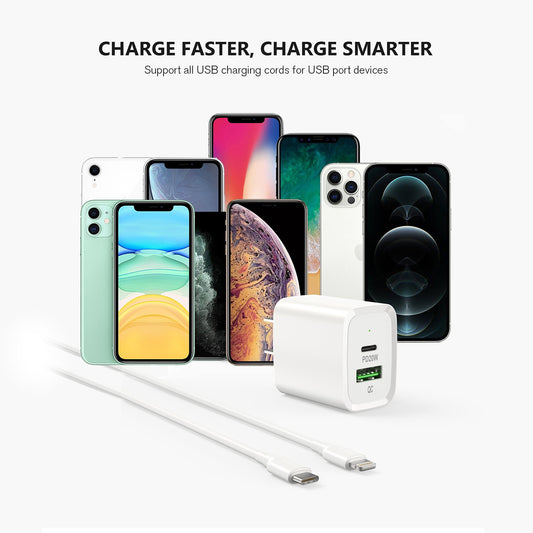 EC49-CL-WH 20W PD/QC Wall Charger & 5FT Cable for C to 8pin - ESoulk Carga Rápida 20W Cargador de Pared - Entrega Energía - Cable USB-C 5 pies a 8 pines
